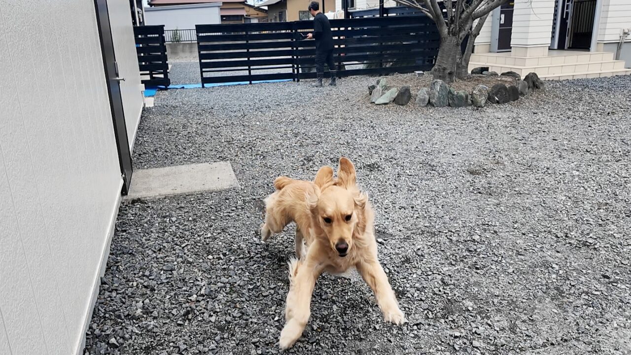 1週間の安静期間を終えたうみ。今日はパパの作業に付き合います。元気いっぱいのうみ。庭で大興奮して走り回ります。また怪我をするんじゃないかと心配になりますが若い大型犬の体力は凄いんです。こればかりはしょうがないですね。